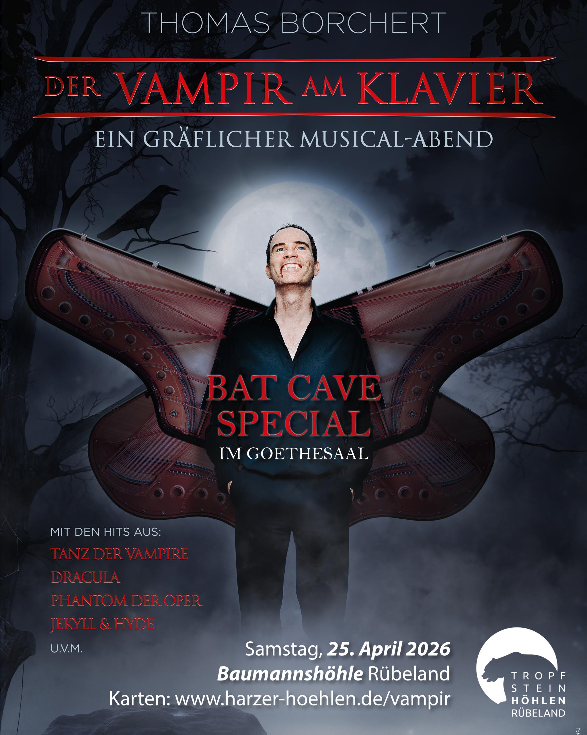 Musicalstar Thomas Borchert, der Vampir am Klavier, öffnet erstmalig seine Gruft für ein exklusives Konzert-Event im imposanten Goethesaal der Harzer Baumannshöhle. Wenn der Graf zwischen Stalaktiten und Stalagmiten seine Stimme erhebt, erklingt vielleicht sogar des Meisters persönlicher Fledermaus-Chor -leider nur hörbar für die echten Vampire im Publikum…